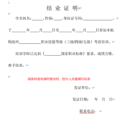 4、结业证书(国家标准中有课时固定的,社会人员需出具培训学时证明,培训学校盖章有效;校内学员培训方案中符合标准规定课时即可)