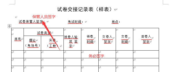 考试中要详细填写《安徽国防科技职业学院考场记录表》(附件10)(理论2名考评员签字、实操3名考评员签字)、《职业技能等级评价考生签到表》(附件11)、《职业技能等级评价考试考务、巡考记录表》(附件12),并全部签完字,连同考试试卷一并提交继续教育学院留存(整个考试过程需全程录像,考试结束后三天内将视频送至继续教育学院,无考试录像本次考试作废处理。)