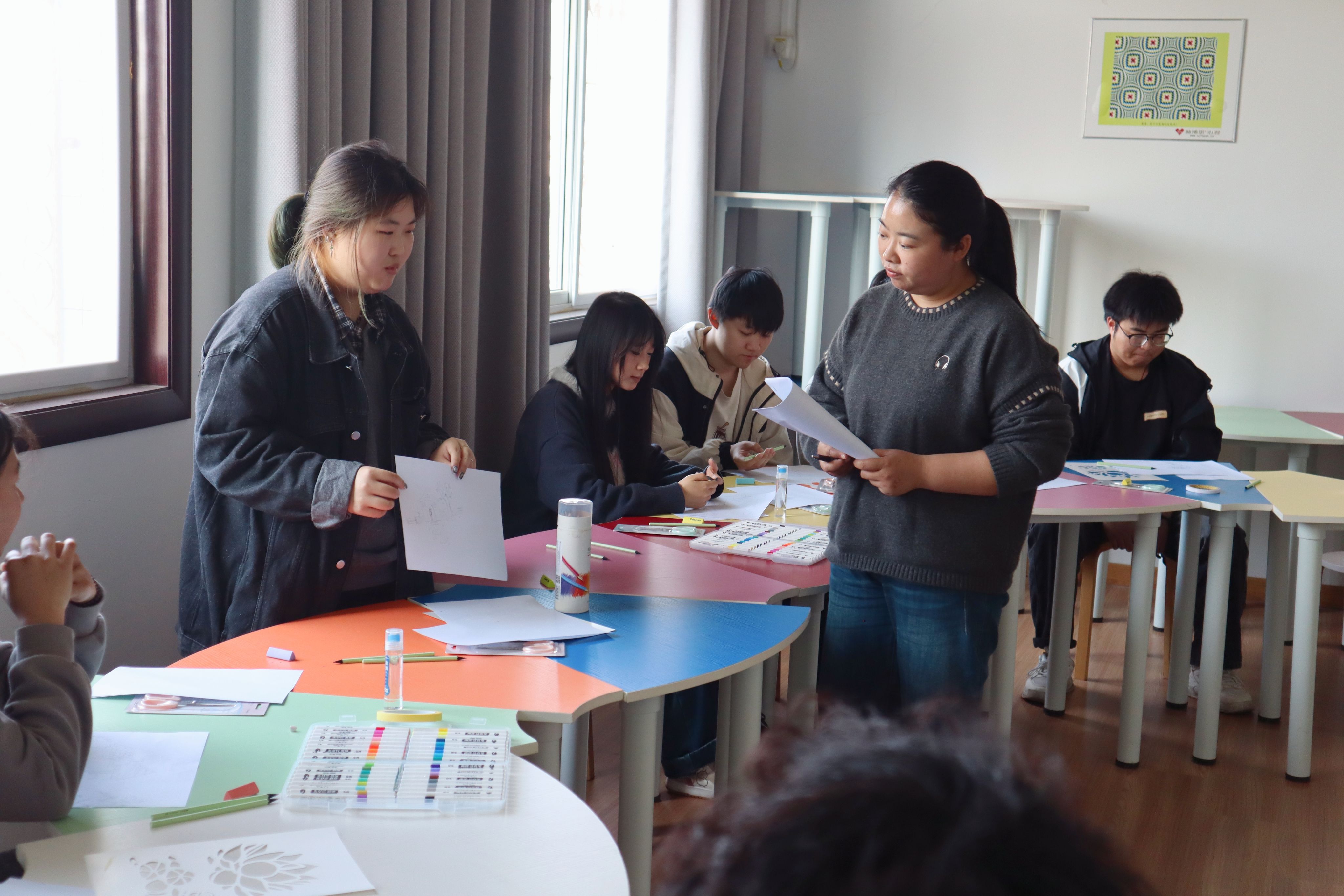 分享交流中,大家展示作品并讲述情绪变化,团体成员相互给予正向反馈,现场充满理解与支持。“从烦躁到平静,我看到了新的可能。”一位同学分享道。