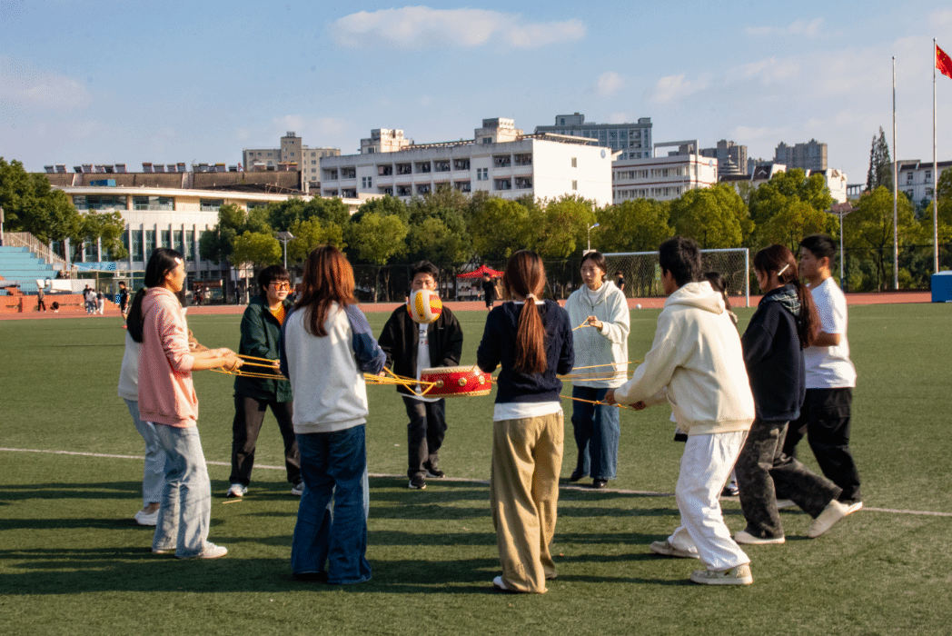 作为本次活动的压轴项目,“同心鼓”要求队员们牵拉鼓绳,共同控制鼓面颠击排球。从最初的频繁失误到逐渐掌握节奏,再到突破自我创下佳绩,队员们在反复练习中培养了默契,也学会了在压力下保持冷静、相互鼓励。活动结束后,心理委员们纷纷表示,通过此次拓展不仅收获了友谊,更提升了自身的团队协作能力和问题解决能力。