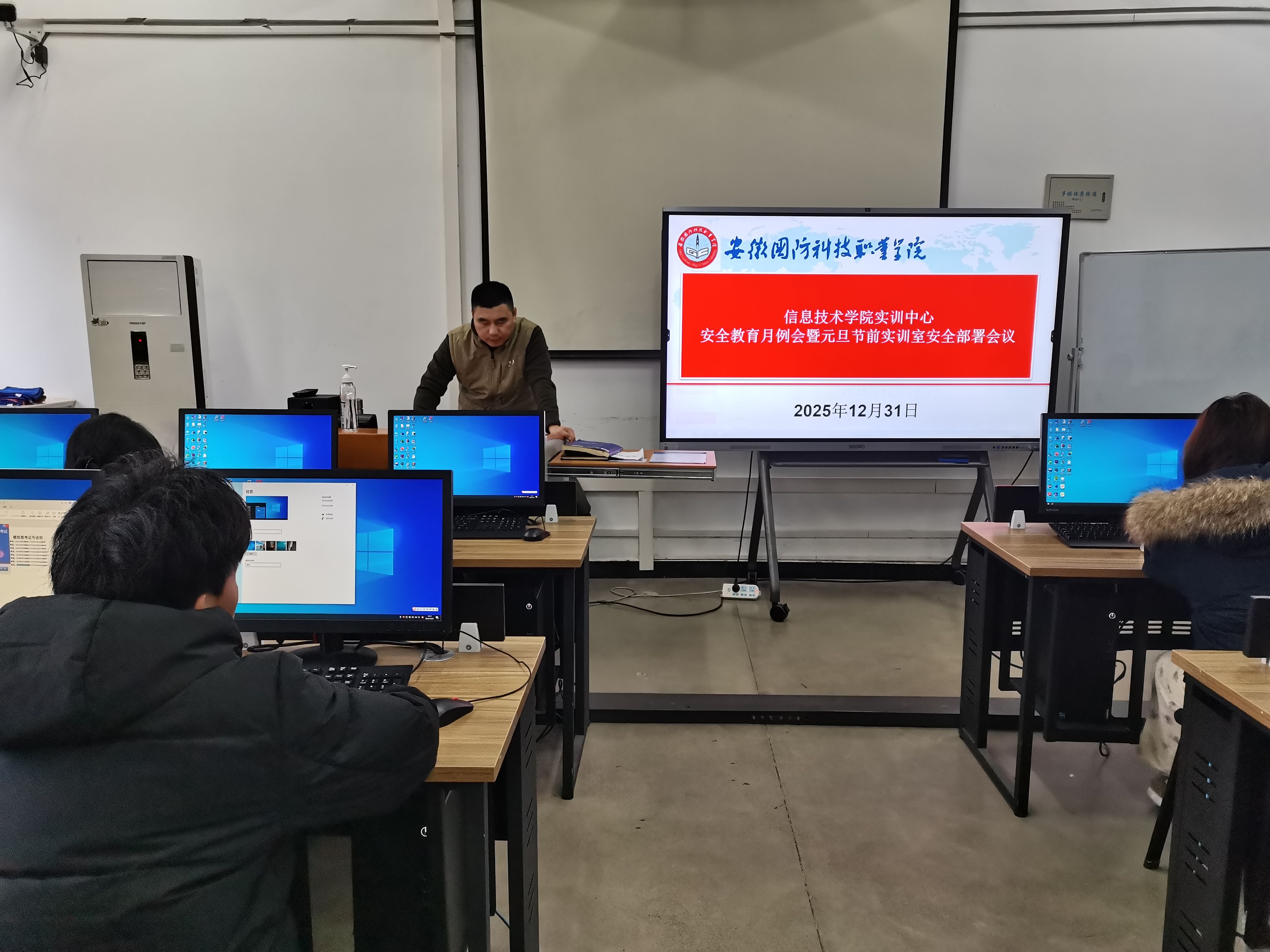 本网讯(信息技术学院 余骑兵)为深入贯彻落实校园安全稳定工作要求,进一步提升实训室安全管理水平,确保节假日期间安全有序,信息技术学院实训中心于12月31日在秉心楼801组织召开了安全教育月例会暨元旦节前实训室安全部署会议。会议由实训中心李珈老师主持,全体实训室管理人员参加了会议。