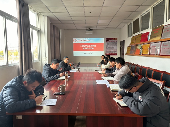 本网讯(信息技术学院 王雪)3月9日,信息技术学院党总支副书记杜洪宇主持召开三月份学生工作例会,学院党总支书记王胜出席会议,全体专职辅导员参加会议,会议聚焦新学期学生工作开局,明确年度重点任务、细化推进举措,为全年学生工作有序开展筑牢开局基础。