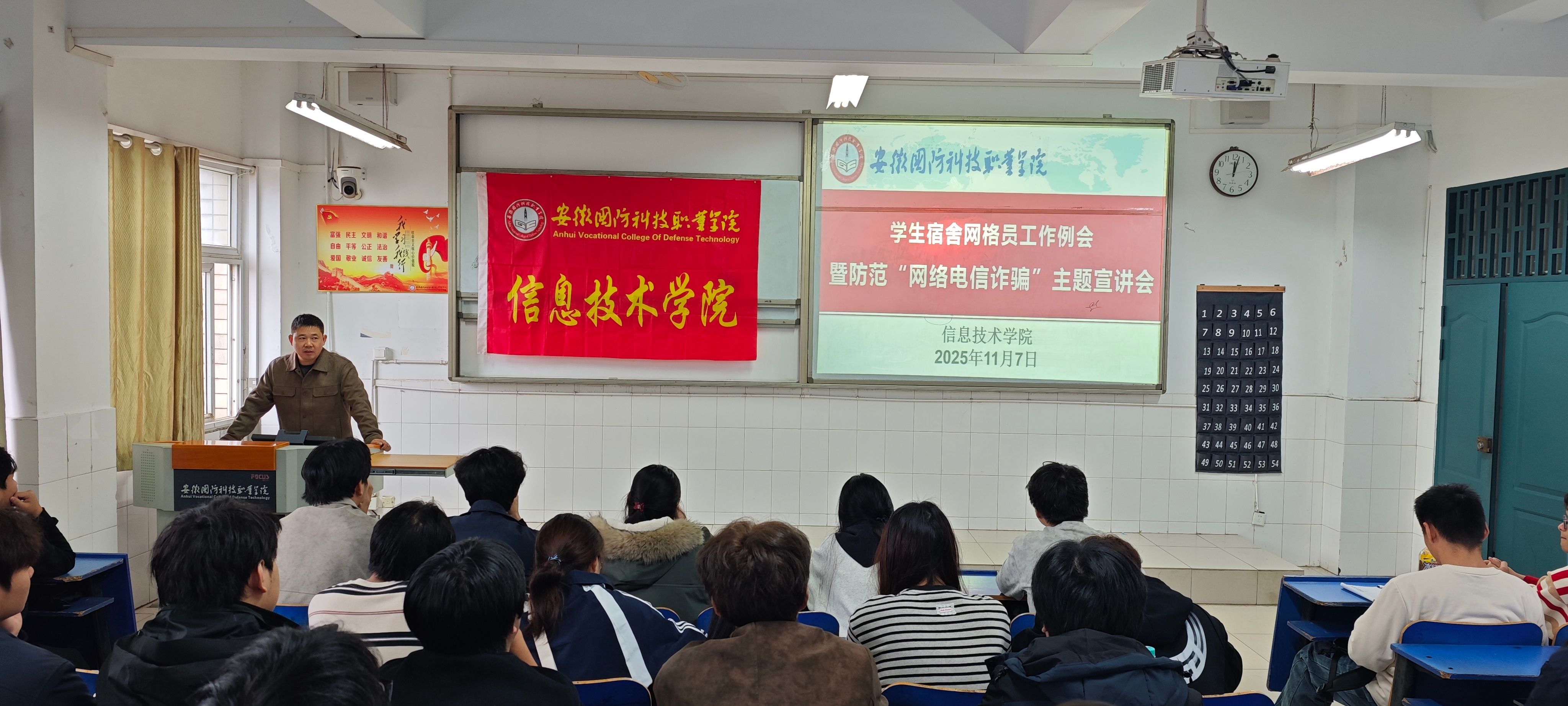 本网讯(学生通讯员 唐乐天)为提升学生反诈防诈意识与自我保护能力,织密校园安全防护网,11月7日,信息技术学院在二教205教室召开学生宿舍网格员工作例会暨“防范网络电信诈骗”主题宣讲会,辅导员赵德志主讲,全体学生宿舍网格员参加。