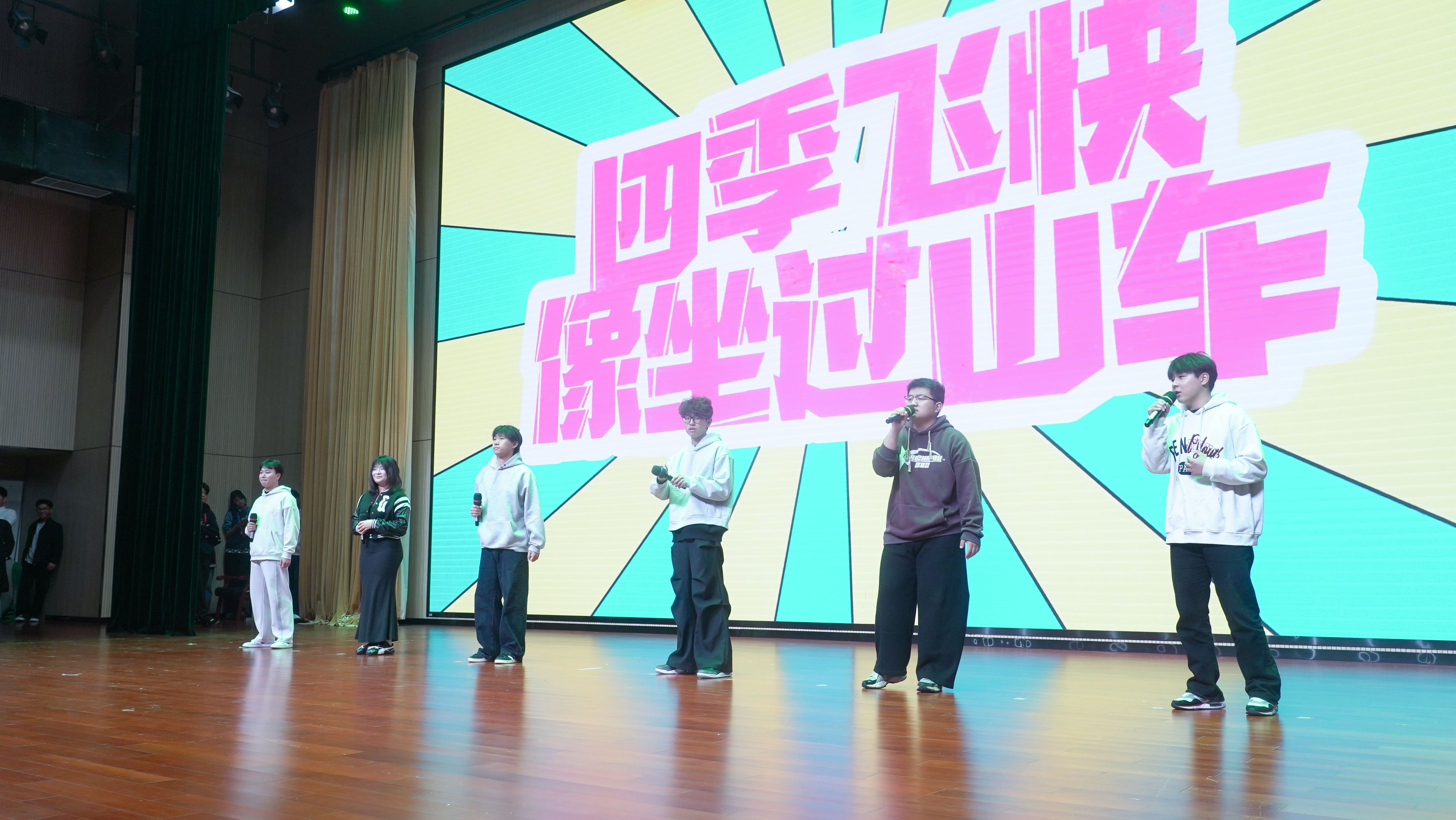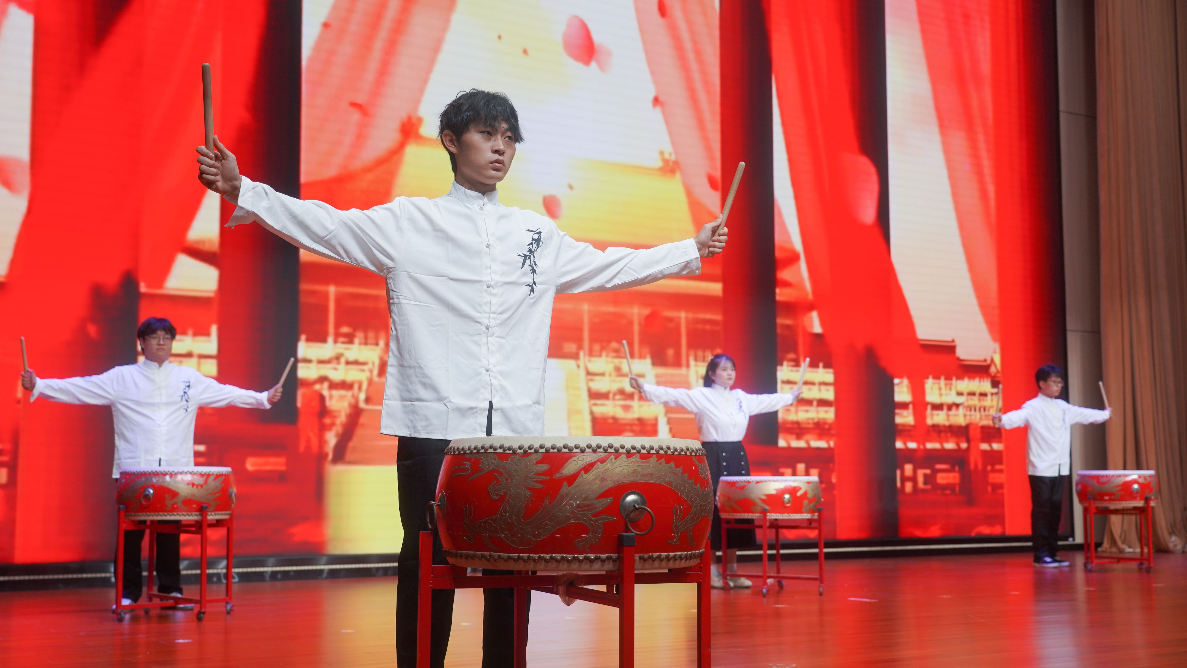 鼓舞《鼓醉山河》五名鼓手手持鼓槌列阵而立,武者腰身扭转间将武术的刚柔并济化入鼓点;小合唱《他只是经过》听他们用歌声讲述大学生的青春故事;歌伴舞《我的未来式》用充满活力的歌伴舞,展现了昂扬向上的精神风貌与时代担当。