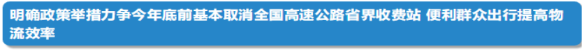 为落实党中央、国务院深化收费公路改革部署,将《政府工作报告》提出的两年内基本取消全国高速公路省界收费站的任务提前至力争今年底实现,减轻消费者负担和企业成本、扩大有效需求,会议确定,
