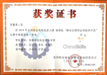 本网讯 2019年6月3日,由我校刘志远、李壮、李泰民三位同学和沙有闯、付贤政两位指导老师组成的超强战队,代表安徽,在2019年全国职业院校技能大赛高职组“移动互联网应用软件开发”赛项激烈角逐中,再以骄人成绩一举夺得一等奖!实现了我校该赛项国赛的“三连冠”,也一举成就了我校该赛项国赛的“四冠王”伟业!可喜可贺!双擘点赞!不仅是安徽国防科技职业学院的自豪,更是安徽高等职业教育的骄傲!